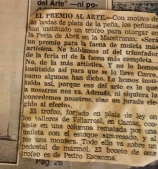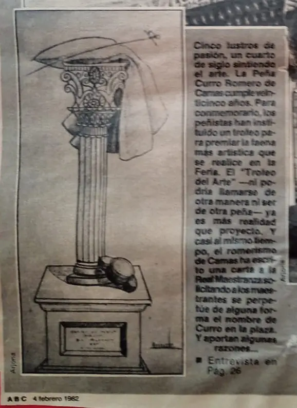 Trofeo a la faena del arte, Peña Curro Romero. Idea y diseño original de Pedro Escacena Barea. Camas, abril 1982.